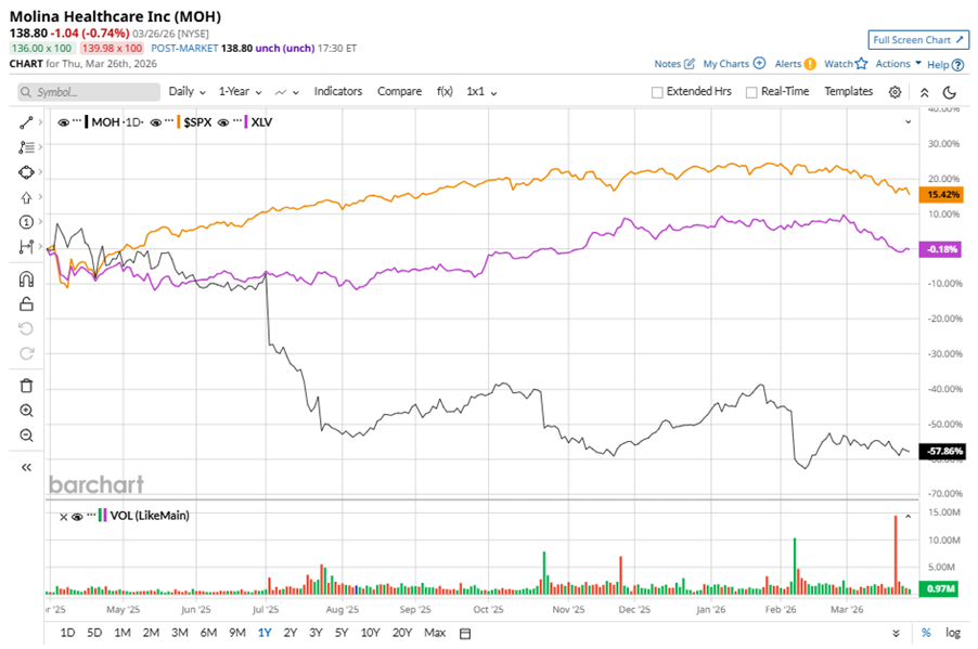 MOH stock has significantly underperformed the S&P 500 Index’s ($SPX) 13.4% gains over the past 52 weeks, with shares down 57.1% during this period. Similarly, it considerably underperformed the State Street Health Care Select Sector SPDR ETF’s (XLV) marginal returns over the same time frame.
