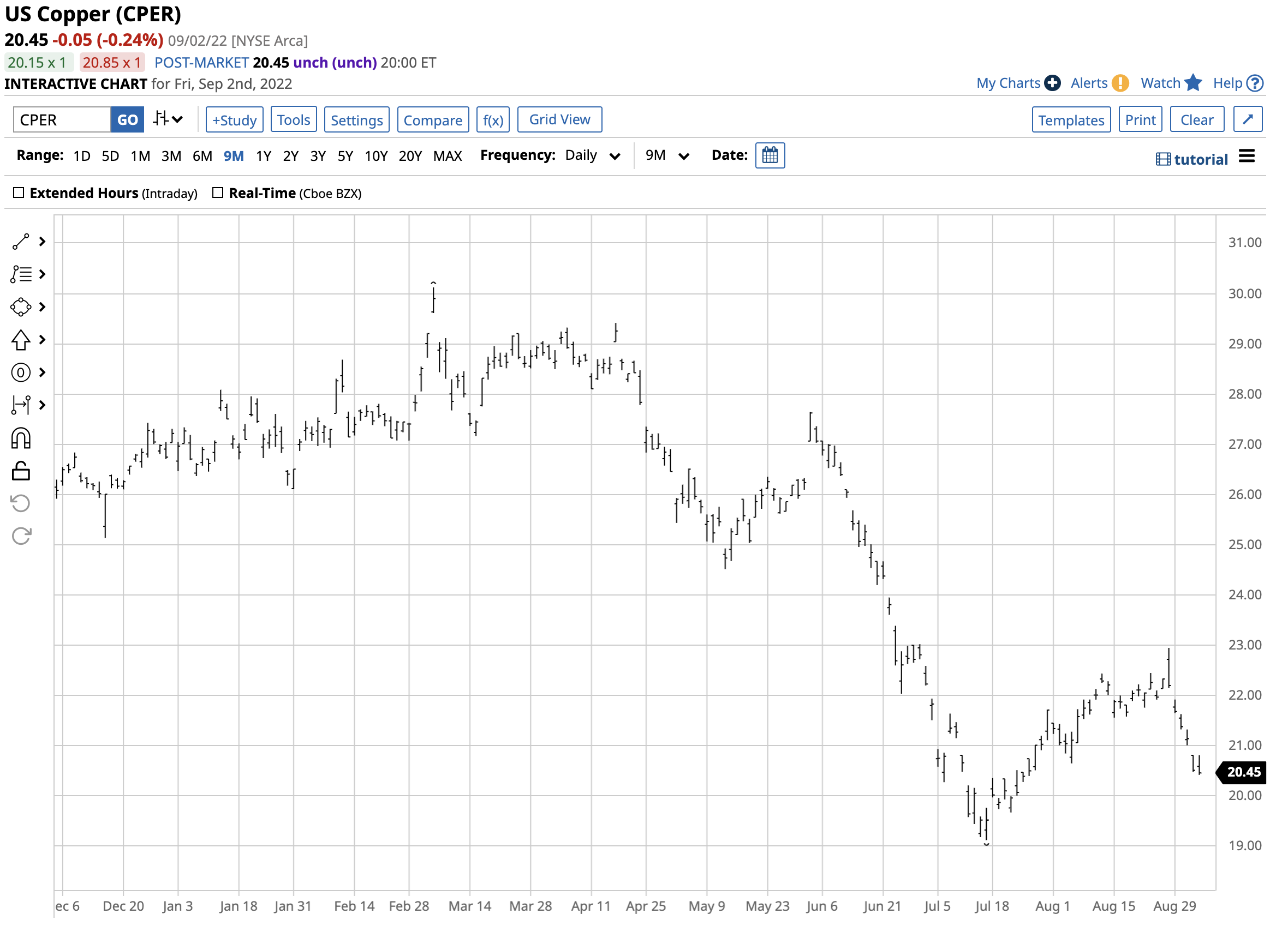 - At $20.45 per share, the US Copper ETF product (CPER) had $143.616 million in assets under management. The ETF trades an average of 94,610 shares daily and charges a 1.08% management fee.Â