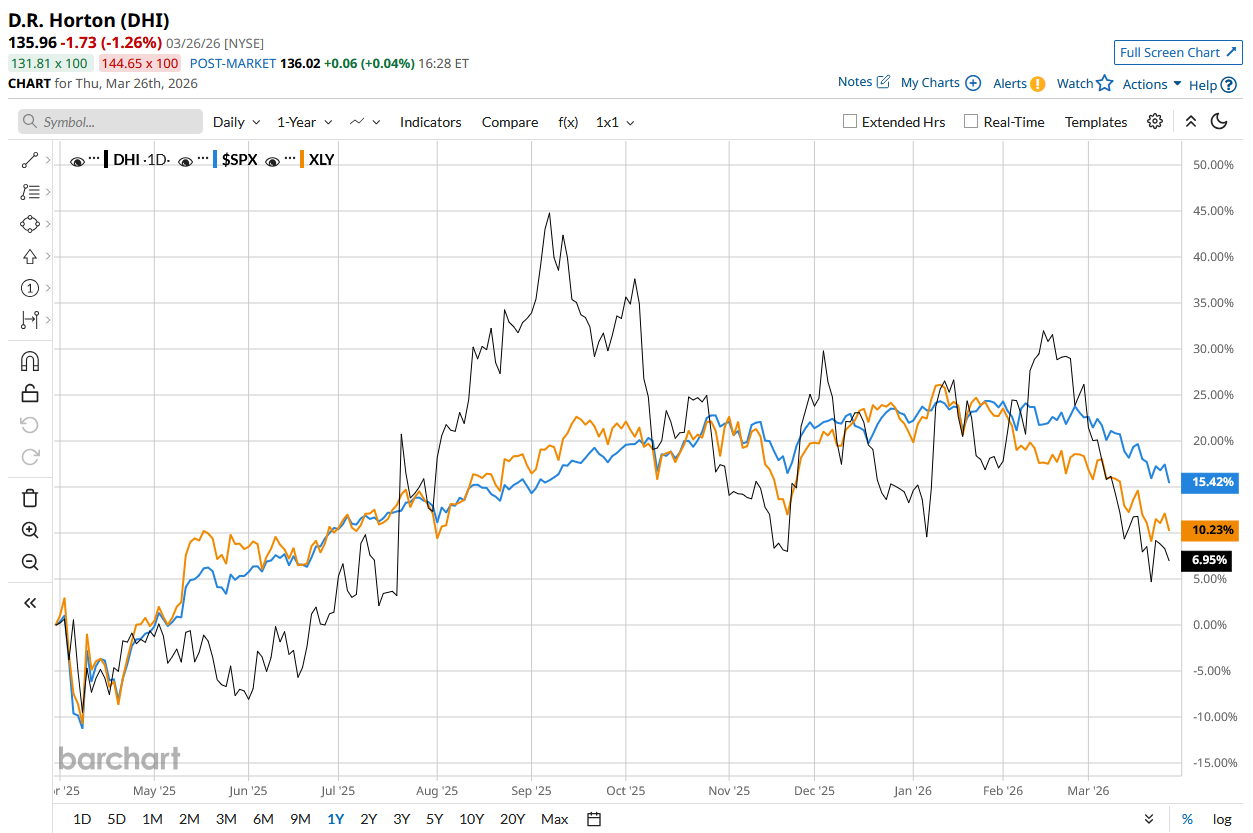 DHI stock has surged 5.1% over the past 52 weeks, underperforming the S&P 500 Index’s ($SPX) 13.4% rise and the State Street Consumer Cyclical Select Sector SPDR ETF’s (XLY) 7.1% return during the same time frame.