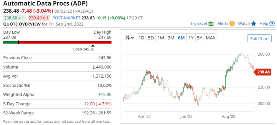 ADP is showing an IV Percentile of 51% and an IV Rank of 45.22%. The current level of implied volatility is 24.76% compared to a 52-week high of 35.46% and a low of 15.92%.