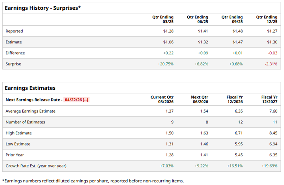 The Dallas, Texas-based company is slated to announce its fiscal Q1 2026 results soon. Ahead of the release, analysts predict the company to report EPS of $1.37, up over 7% from $1.28 in the year-ago quarter. It has exceeded Wall Street's earnings expectations in three of the past four quarters while missing on another occasion.