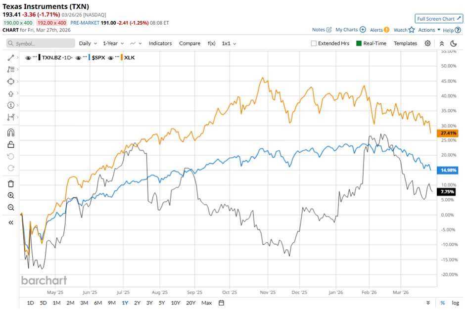 Shares of Texas Instruments have gained 6.2% over the past 52 weeks, lagging behind the broader S&P 500 Index's ($SPX) 13.4% return and the State Street Technology Select Sector SPDR ETF's (XLK) 24.2% surge over the same period.