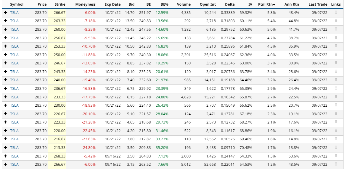 If TSLA stays above 266.67 and the put expires worthless, the trader makes a 5.8% gain in just over one month. That works out to be 48.4% on an annualized basis.