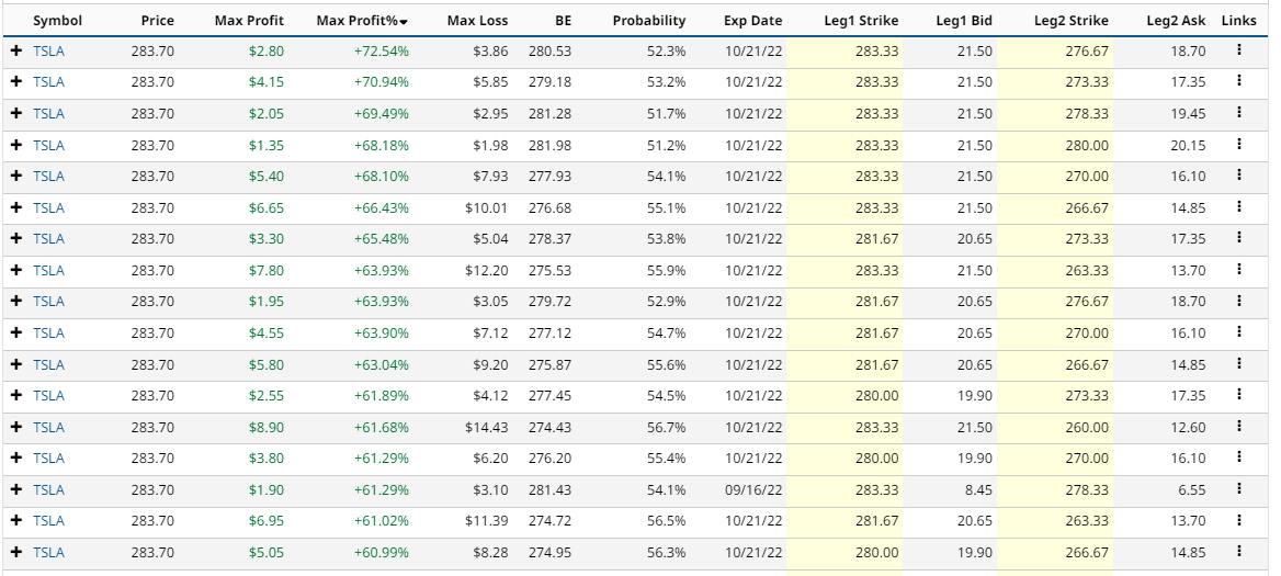 Running the standard Barchart Bull Put Spread Screener shows these results for TSLA: