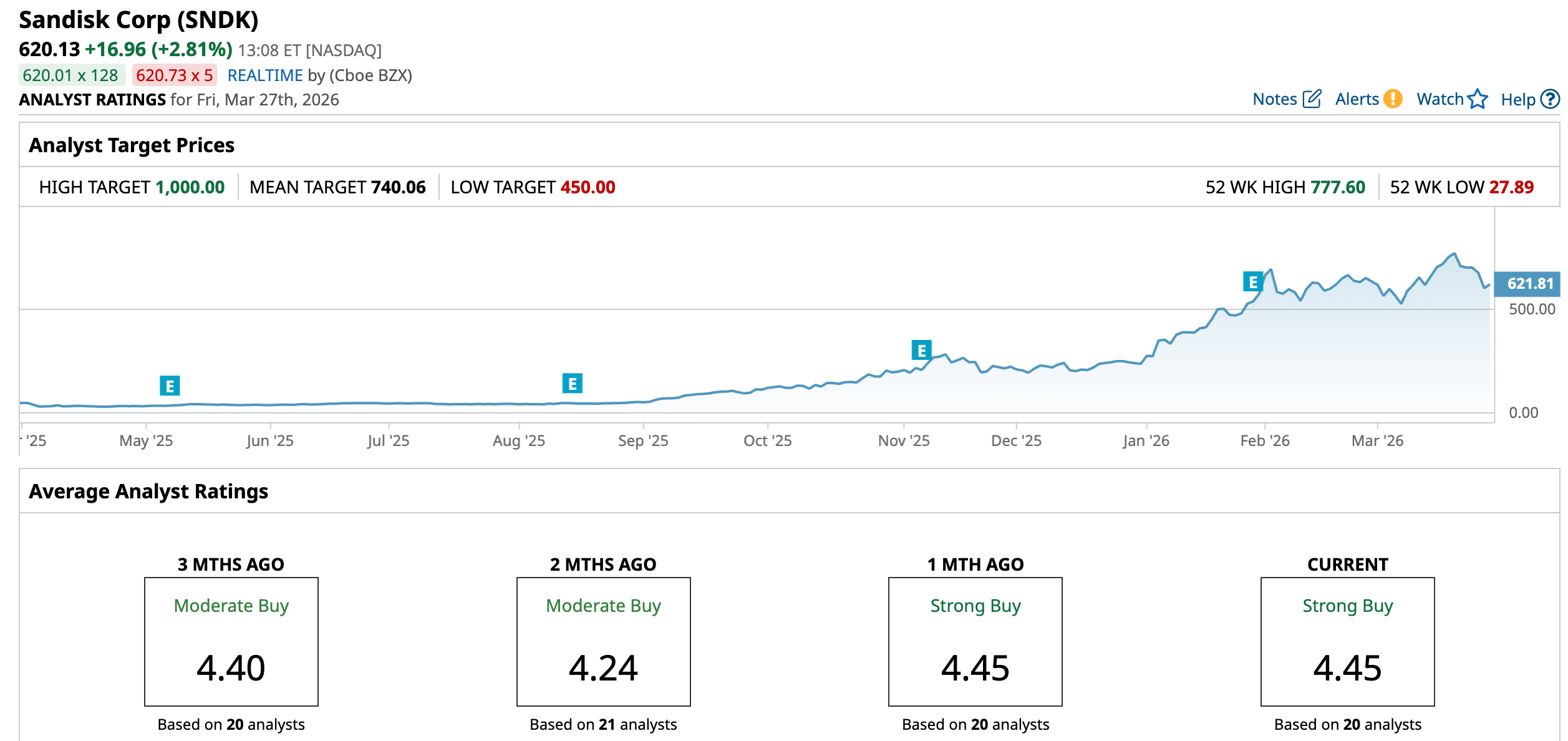 SNDK’s average analyst price target of $740.06 indicates an upside of around 19.3%, while Bernstein SocGen’s Street-high target price of $1,000 suggests that the stock could rally as much as 61.3%.