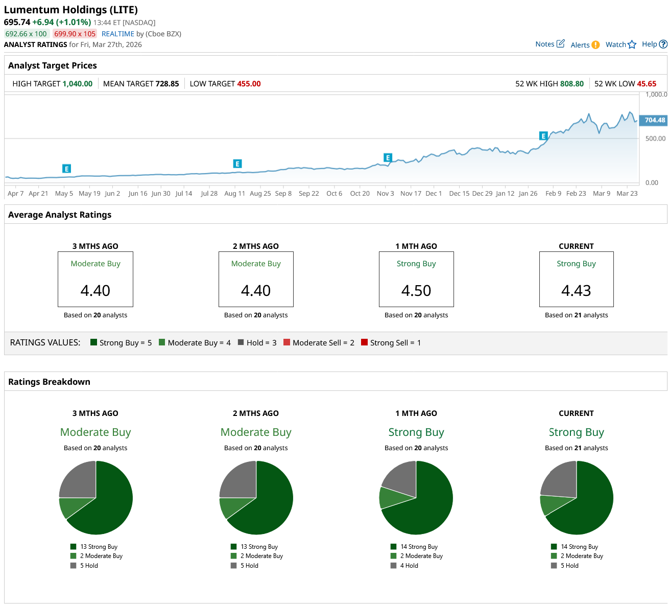 Despite the stock’s substantial rally, sentiment on Wall Street remains positive. Analysts continue to highlight the company’s exposure to long-term AI-driven demand as a key investment driver. Notably, at least one analyst has a 12-month price target of $1,040 for LITE stock. Based on the recent closing price of $688.80, this projection implies a potential upside of about 51%.