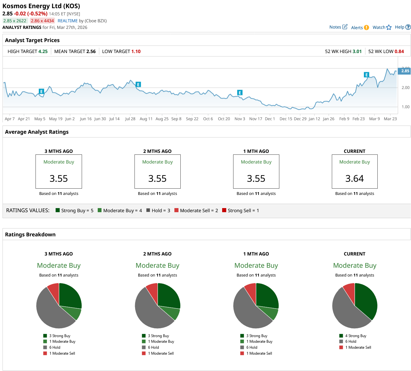 Analysts believe KOS stock can rally another 49% from current levels, based on its high price estimate of $4.25. Overall, the consensus on Kosmos stock is a “Moderate Buy.” Of the 11 analysts who cover the stock, four rate it a “Strong Buy,” six say it is a “Hold,” and one says it is a “Moderate Sell.”