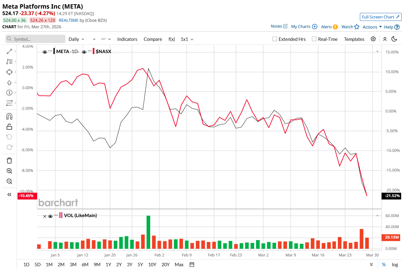 Meta’s legal setbacks have caught the market’s attention. According to Reuters, the Los Angeles jury found the company accountable for addictive platform design, while a separate New Mexico ruling levied a $375 million penalty over child safety violations. While the minimal fines won’t put a dent in Meta’s financials, the biggest concern is these decisions could open the floodgates to thousands of similar lawsuits. META stock dipped sharply by almost 8% on March 26 and is down 21% year-to-date (YTD), compared to the tech-led Nasdaq Composite Index ($NASX) fall of 9.7%.