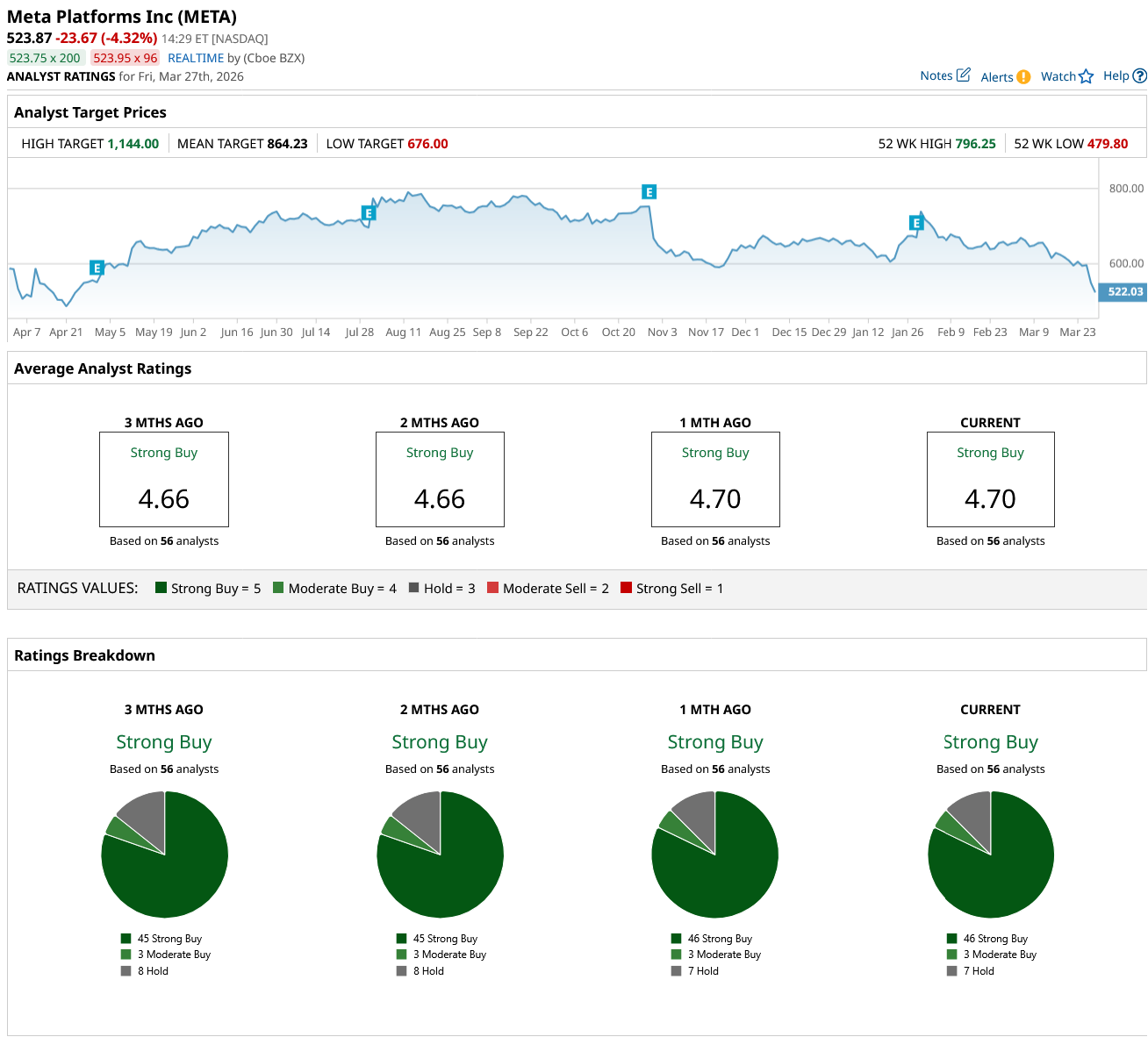 Nonetheless, Wall Street remains hopeful about Meta's AI vision. The consensus on META stock is a “Strong Buy” with an average target price of $864.23, which implies an upside potential of 65% from current levels. Of the 56 analysts tracking the stock, 46 rate it as a "Strong Buy," three as a "Moderate Buy," and seven as a "Hold." META's high price target of $1,144 implies that the stock could go up 118% from its current levels.