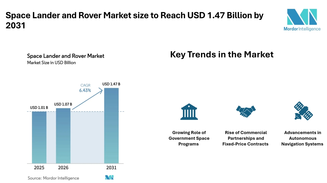 According to Mordor Intelligence, the space lander and rover market size is projected to grow from USD 1.01 billion in 2025 to USD 1.07 billion in 2026, eventually reaching USD 1.47 billion by 2031, reflecting consistent space lander and rover market growth. This upward movement is supported by government-backed missions, rising participation from private companies, and continuous improvements in mobility and navigation systems.