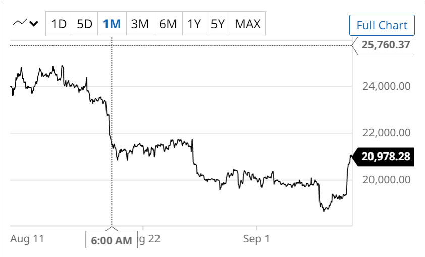 As you can see in the Barchart graph below the premier cryptocurrency, which now has a market capitalization of over $402 billion according to Coinmarketcap, is down from a peak of $24,887 in early August.
