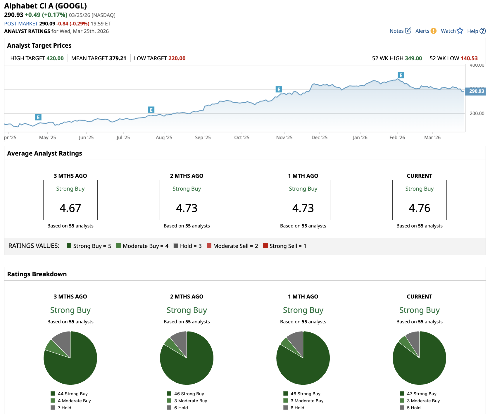 Well below its all-time high, Alphabet trades at a meaningful discount to where it was just months ago despite posting record revenues, record cash flow, and accelerating cloud growth. Out of the 55 analysts covering GOOGL stock, 47 recommend a “Strong Buy” rating, three recommend a “Moderate Buy,” and five recommend a “Hold” rating. The average price target is $379.21, implying potential upside of about 38% from the current levels.