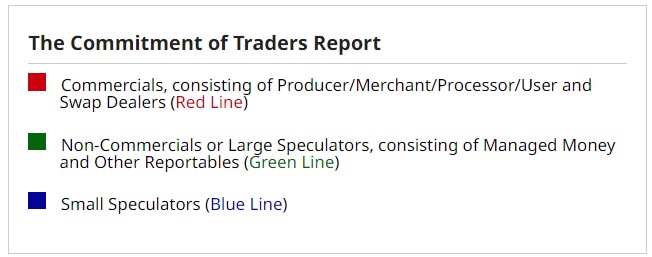The primary participants we want to focus on are the commercial and large speculators. The small speculator (blue line) usually does not have much impact on the market. The numbers in the green (large speculators) and red (commercial) boxes are the net positions held as of the most recent reporting period.Â