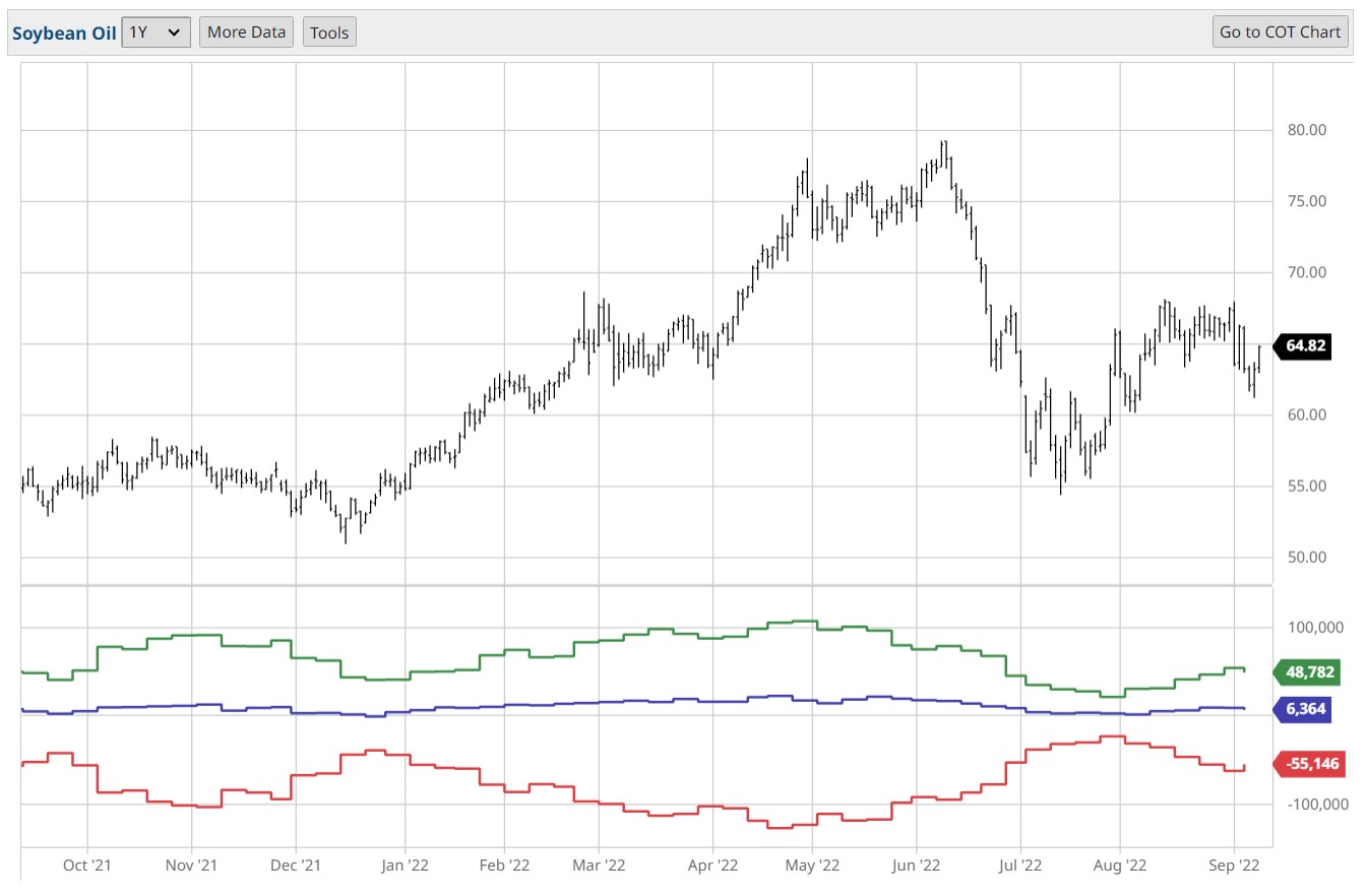 COT charts are only available on daily and higher timeframes. I've chosen one year, but there are many different periods available. COT charts should not be used as a timing tool; another type of analysis is required for proper market timing. Here is a daily COT chart of soybean oil, looking back at one year.Â