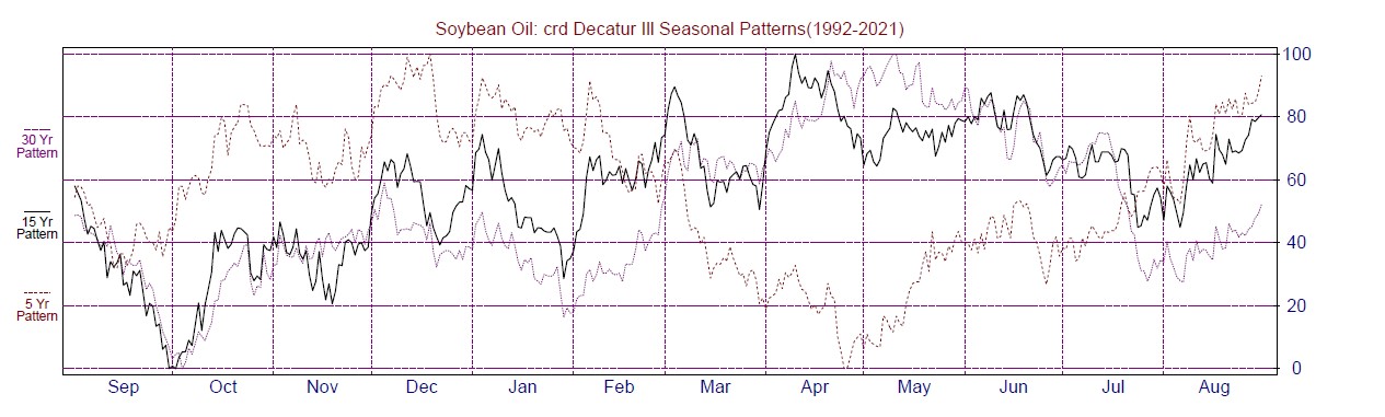 Seasonal patterns do not always work, but combining the confluence of commercial activity enhances that seasonal pattern. The above cash soybean oil chart depicts that the seasonal lows usually occur in late October and seasonal highs in April/May. Confirming that the COT report showed commercial activity supporting these seasonal highs and lows for this particular season.Â