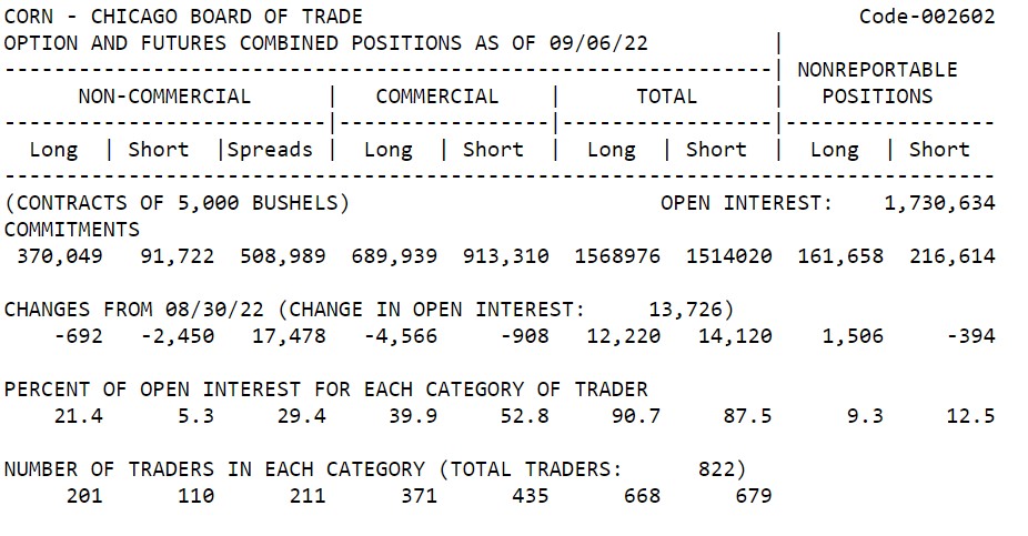 I want to point out how this data confirms who the prominent players are in the futures markets. The COT report shows the large speculators (non-commercial), commercial, and small speculators (non-reportable) positions in the market based on both long and short open positions. Looking at the row "Percent of open interest for each category of trader," it's evident that the commercial trader holds the most significant percentage of the cumulative open interest. Confirming that the futures markets were initially created for commercial traders over 200 hundred years ago, and today are still the most significant participants.Â