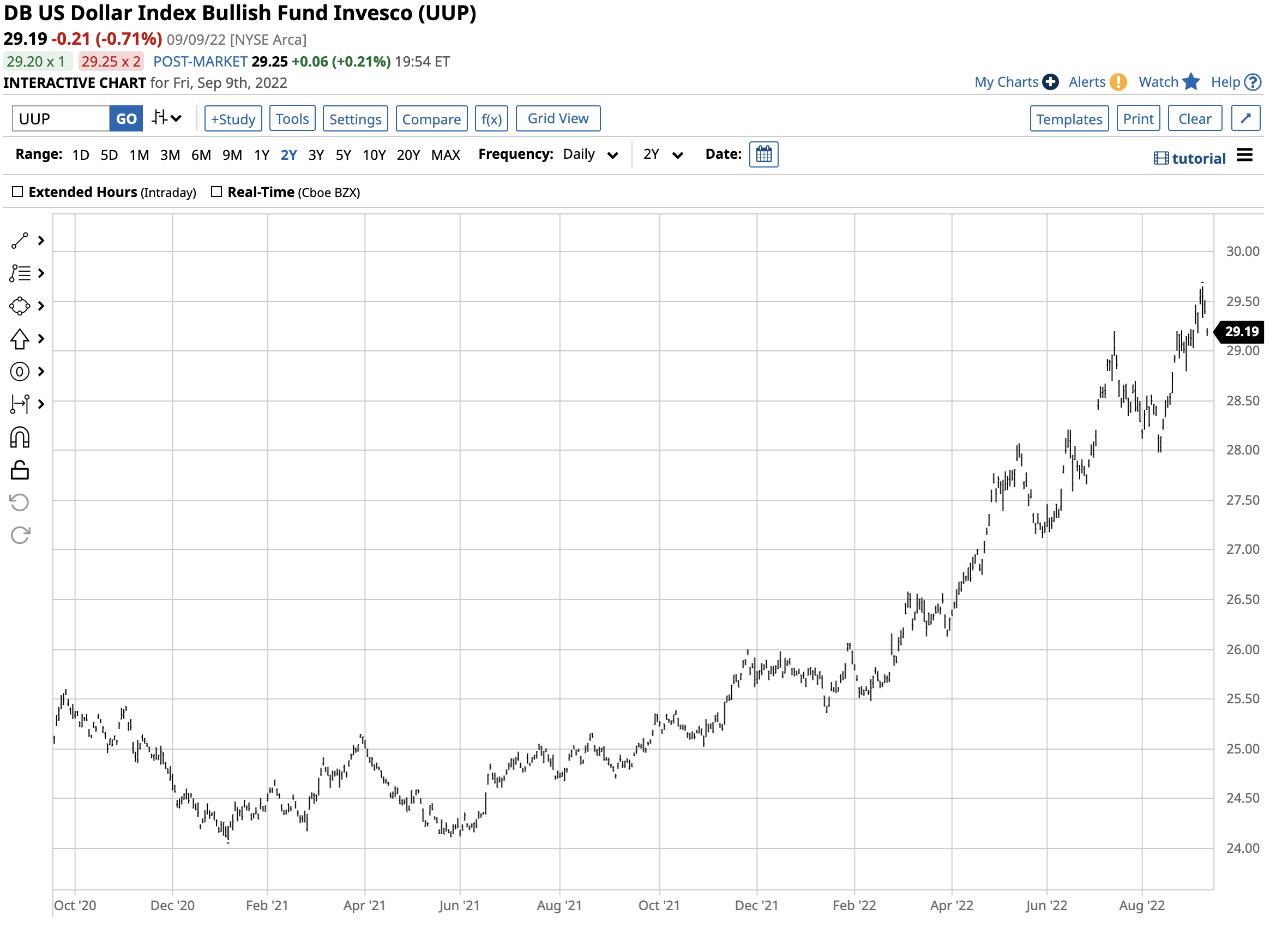 The chart highlights the rise in the UUP ETF from $24.09 in January 2021 to $29.65 per share last week, a 23% increase.Â