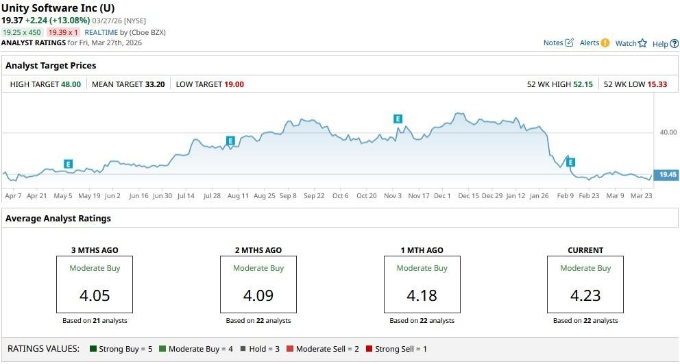 The consensus rating on Unity Software remains at a “Moderate Buy,” with the mean price target of about $33 indicating potential upside of more than 65% from here.