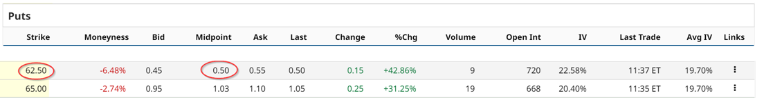 Moreover, a cash-secured put play can provide an even more attractive income play. For example, the put options chain below for Oct.21 shows that investor can earn 50 cents by shorting the $62.50 put strike price.