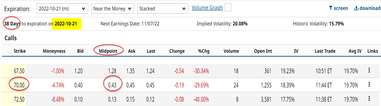 The table below shows that the $70 strike price for call options expiring Oct. 21 has an attractive mid-point price of 43 cents.