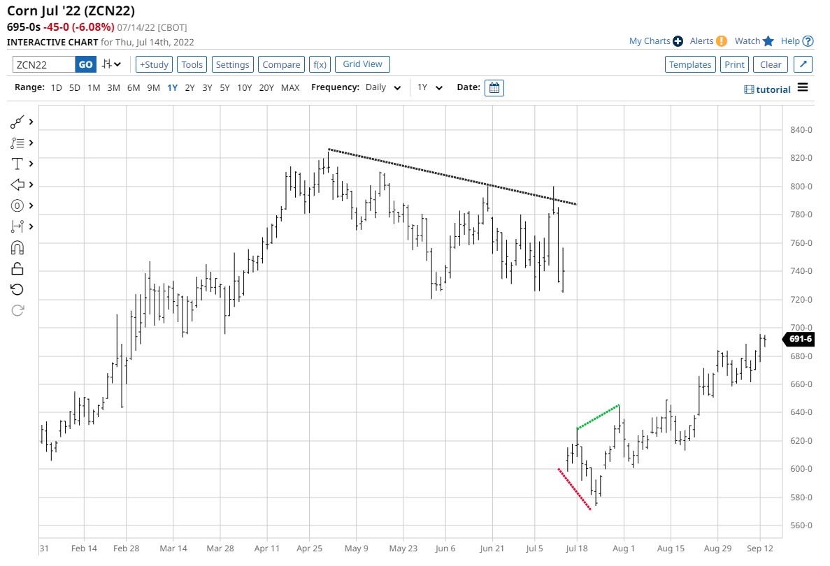 Also, notice that the high made in May for the July contract was about 8.20 per bushel. At the same time, the high created in the December contract was 7.60. Now imagine how different the prices could be if you used the near-month continuous chart to find resistance for the current rally in the December contract.Â