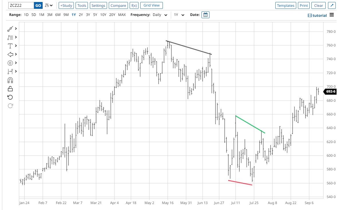 Both of these are the corn contract-specific continuous charts. The upper one is July (planting season), and the lower one is December (harvest season). To illustrate how different the prices and patterns for each contract month are, I used color-coded lines.