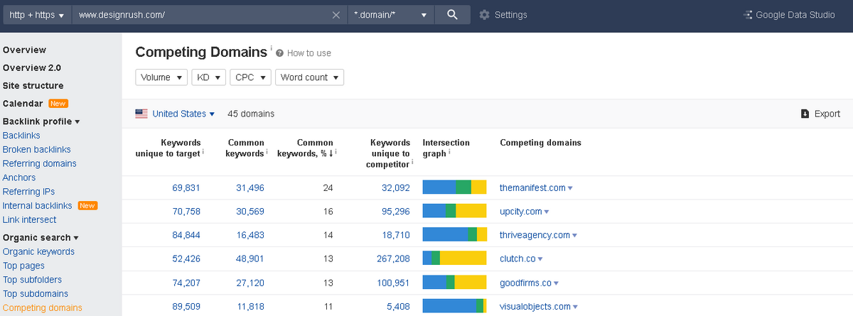 Start with finding your competitors. You can do this by reviewing the “Competing domains” report in Site Explorer tool. Enter your website URL and see what competitors are within the niche.