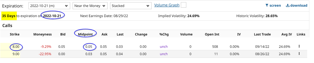 The table from Barchart below shows that the $8.00 call strike price for October 21 provides a covered call investor a 5-cent premium.