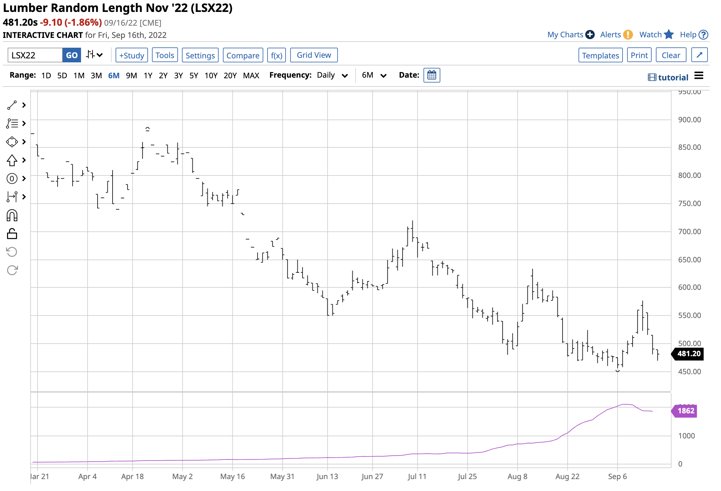 While nearby random-length lumber futures price has plunged from the March 2022 $1,357.30 per 1,000 board feet high, they remained above a critical technical support level on September 16.