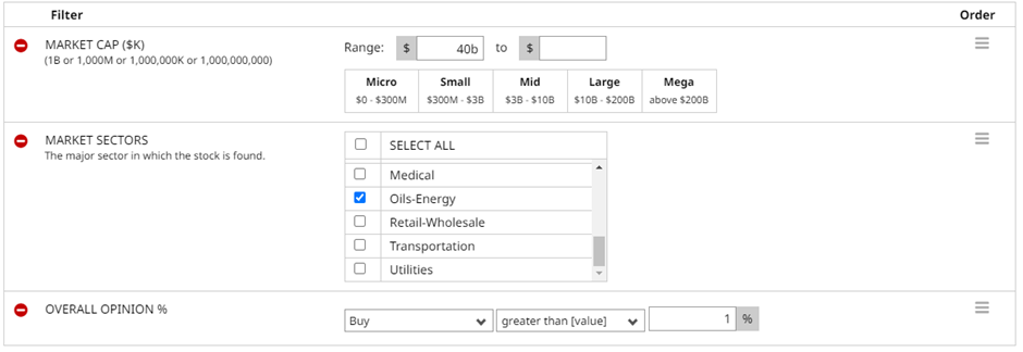 Let’s firstly check which bank stocks have a Buy Rating. To do this go to the Stock Screener and use these Parameters: