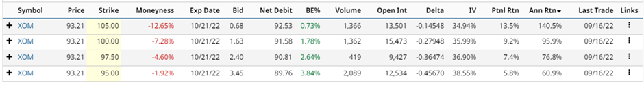 Instead of the October 105 call, let’s look at the October 95 call (last row). Selling the 95 call option for $3.45 generates an income of 3.84% in 32 days, equalling around 42.51% annualized. If XOM closes above 95 on the expiration date, the shares will be called away at 95, leaving the trader with a total profit of $524 (gain on the shares plus the $345 option premium received).