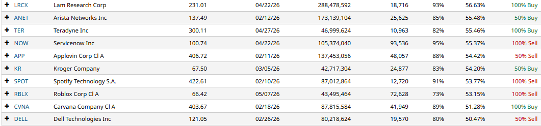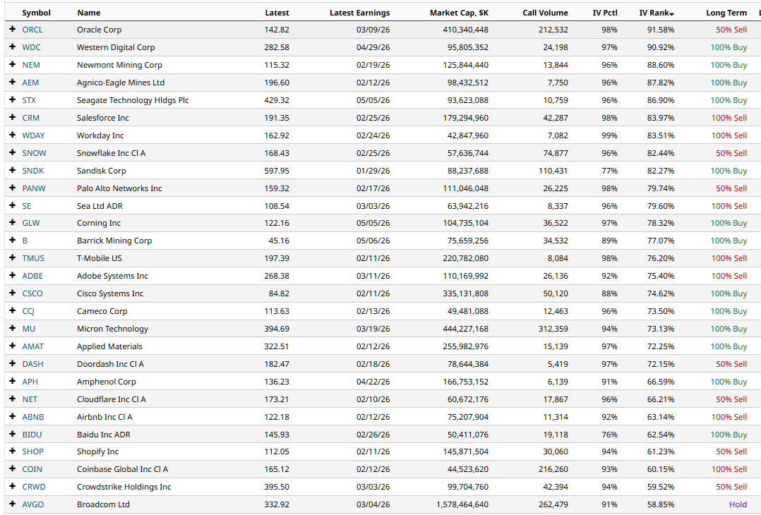 This screener produces the following results sorted by IV Rank.