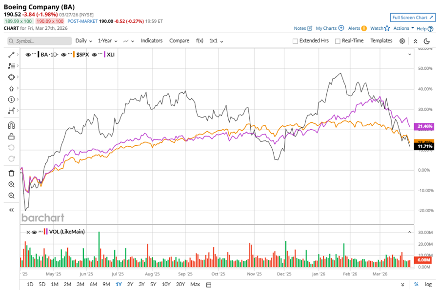 BA stock has underperformed the S&P 500 Index’s ($SPX) 11.9% gains over the past 52 weeks, with shares up 6.4% during this period. Similarly, it lagged behind the State Street Industrial Select Sector SPDR ETF’s (XLI) 19.8% gains over the same time frame.
