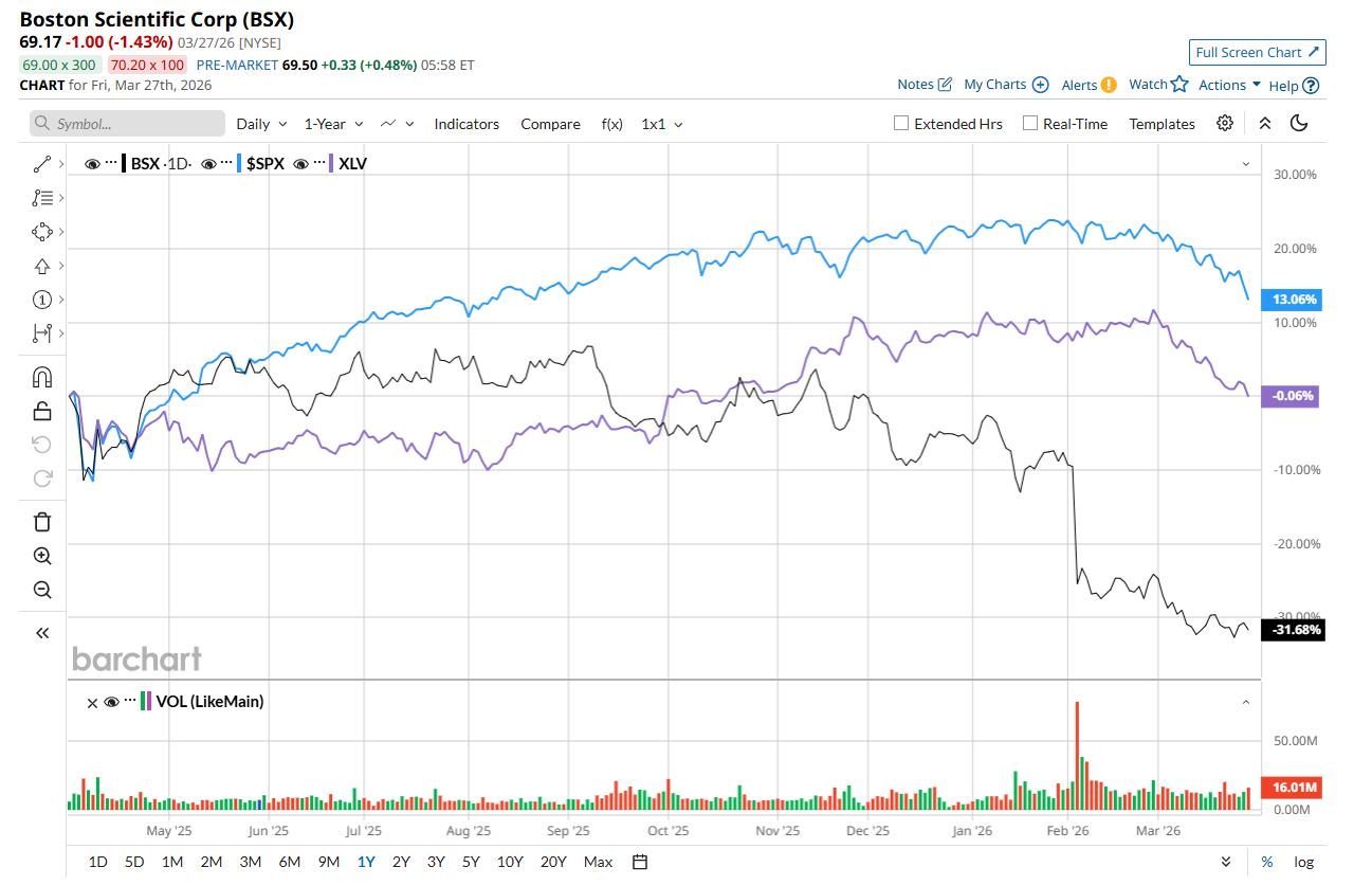 Shares of BSX have declined 31.4% over the past 52 weeks, notably underperforming both the S&P 500 Index's ($SPX) 11.9% return and the State Street Health Care Select Sector SPDR ETF’s (XLV) 1.2% drop over the same time period.