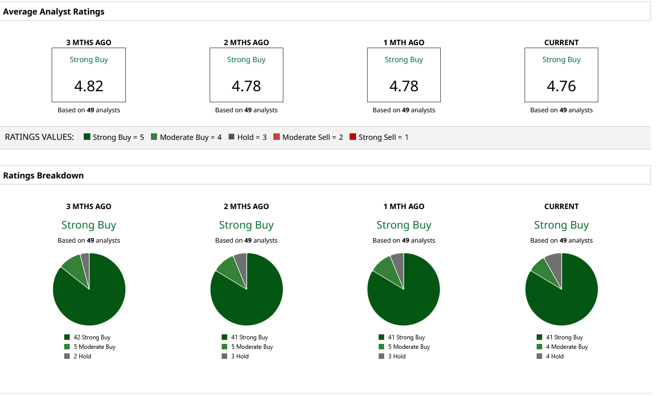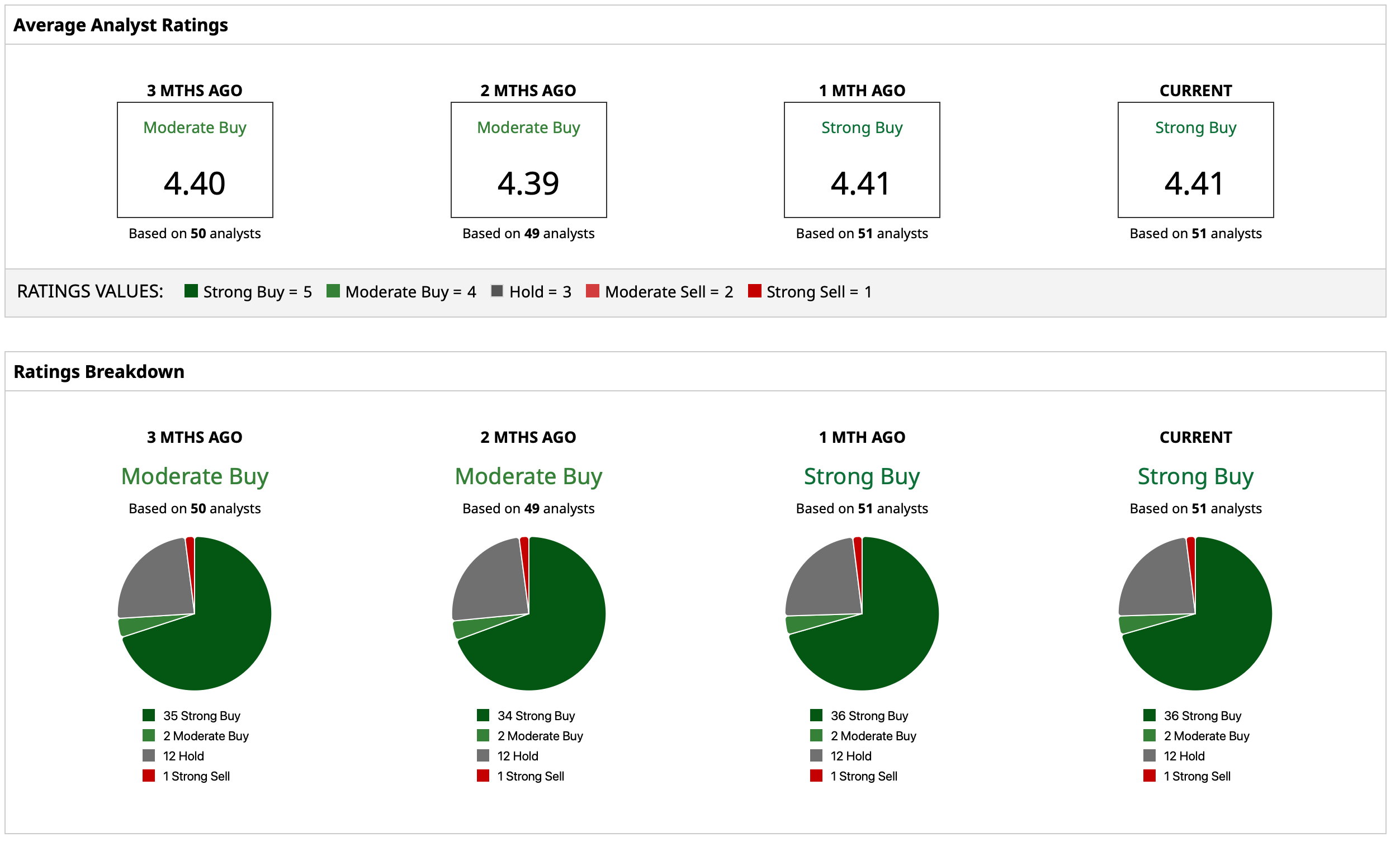 Thus, analysts have attributed a rating of “Strong Buy” for MSFT stock, with a mean target price of $602.57, which indicates an upside potential of roughly 53% from current levels. Out of 49 analysts covering the stock, 41 have a “Strong Buy” rating, four have a “Moderate Buy” rating, and four have a “Hold” rating.