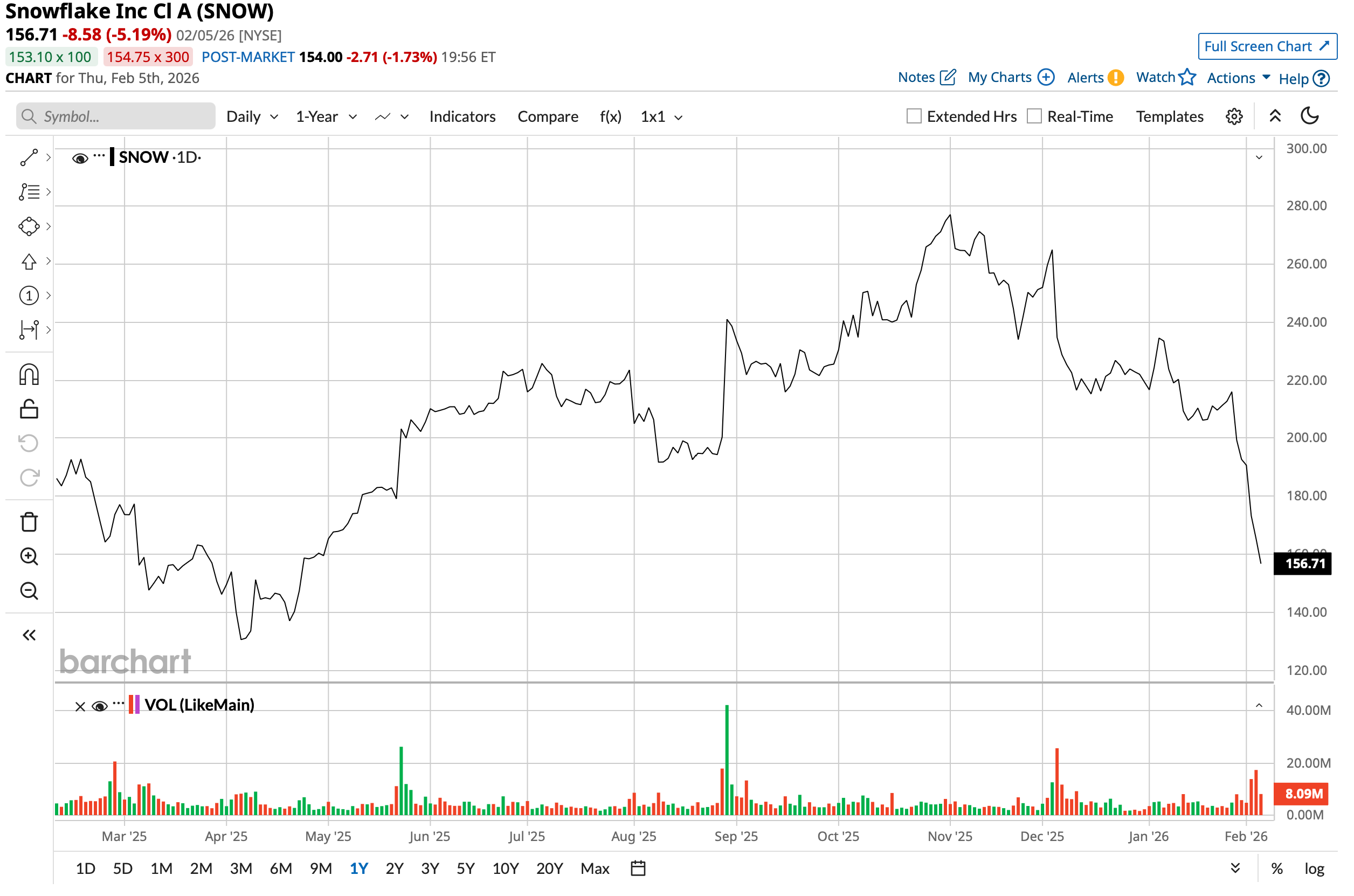 Valued at a market cap of $56.6 billion, the SNOW stock is down 13% over the past year.