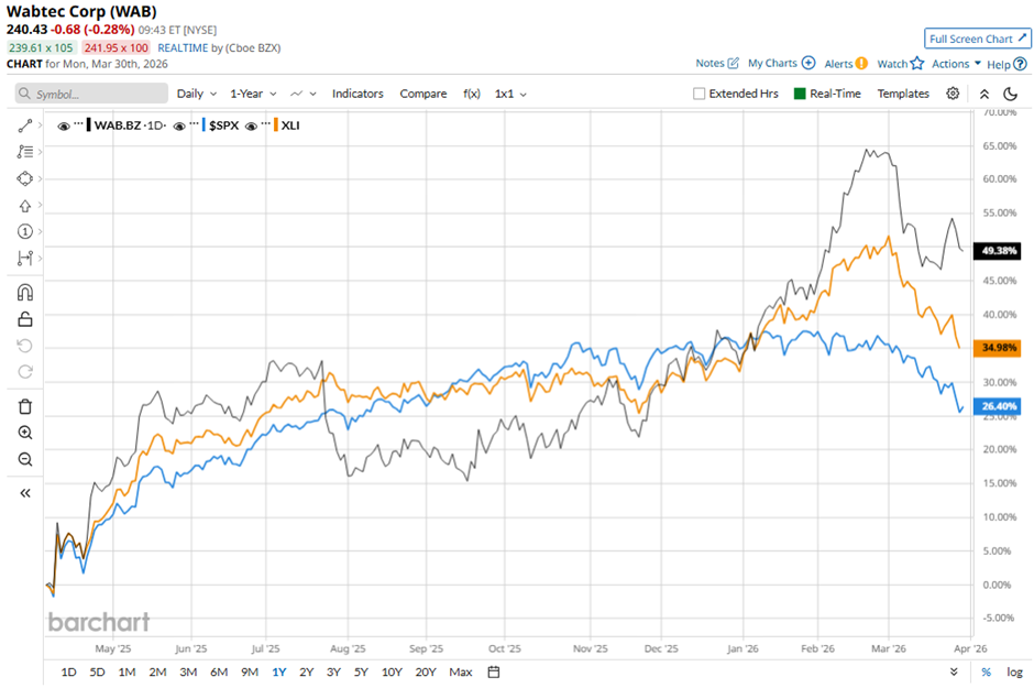 Shares of Wabtec have increased nearly 29% over the past 52 weeks, outpacing both the S&P 500 Index's ($SPX) 11.9% gain and the State Street Industrial Select Sector SPDR ETF's (XLI) 23.2% return over the same period.
