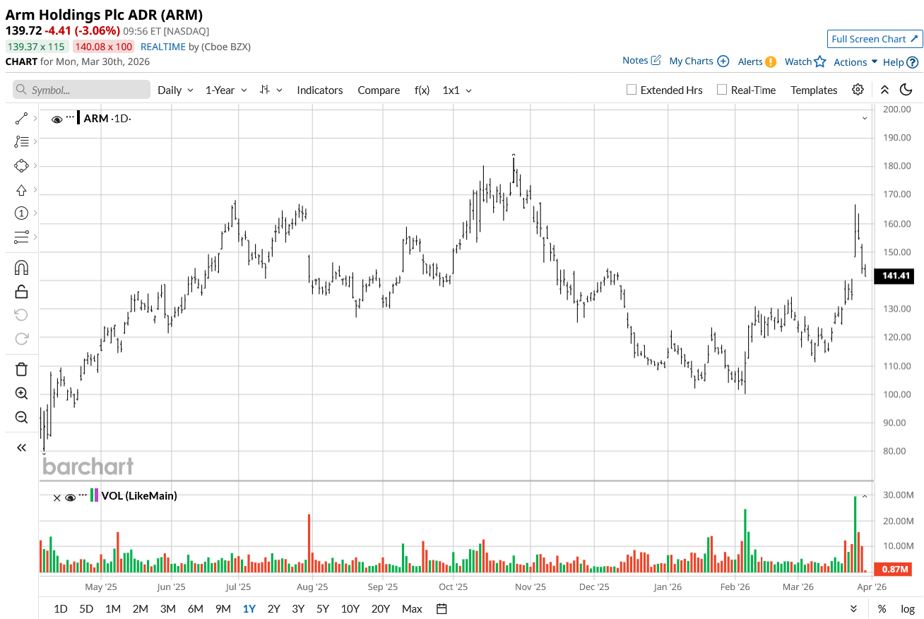 This sets the stage for the recent run in ARM stock's price. While the shares retreated partially on Friday, they are still significantly higher than the 52-week low and are trading within about 20% of the 52-week high. On a broader level, the market appears to be rethinking Arm as a winner in the AI platform space rather than just a royalty collector, especially after the company announced its first in-house-designed data center chip.