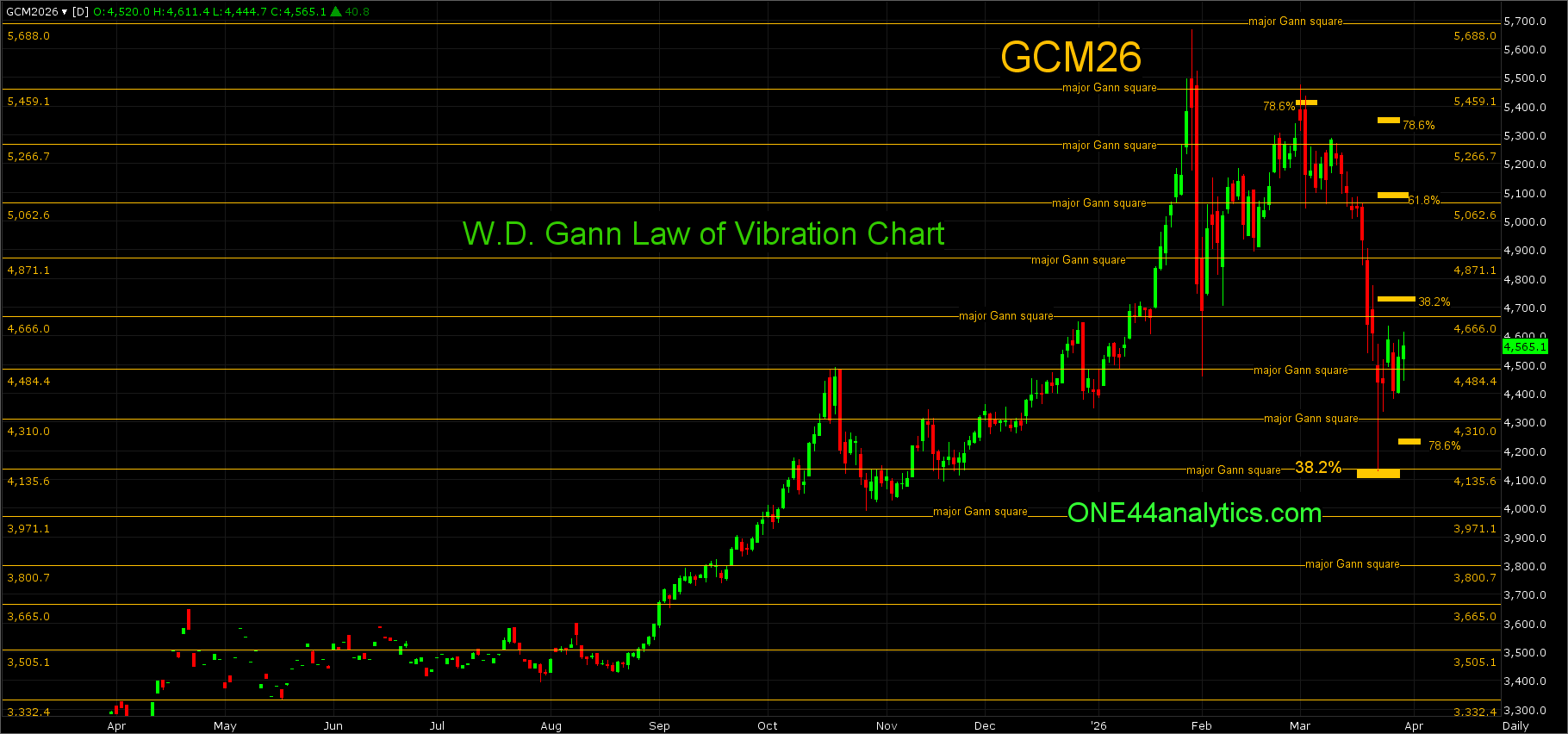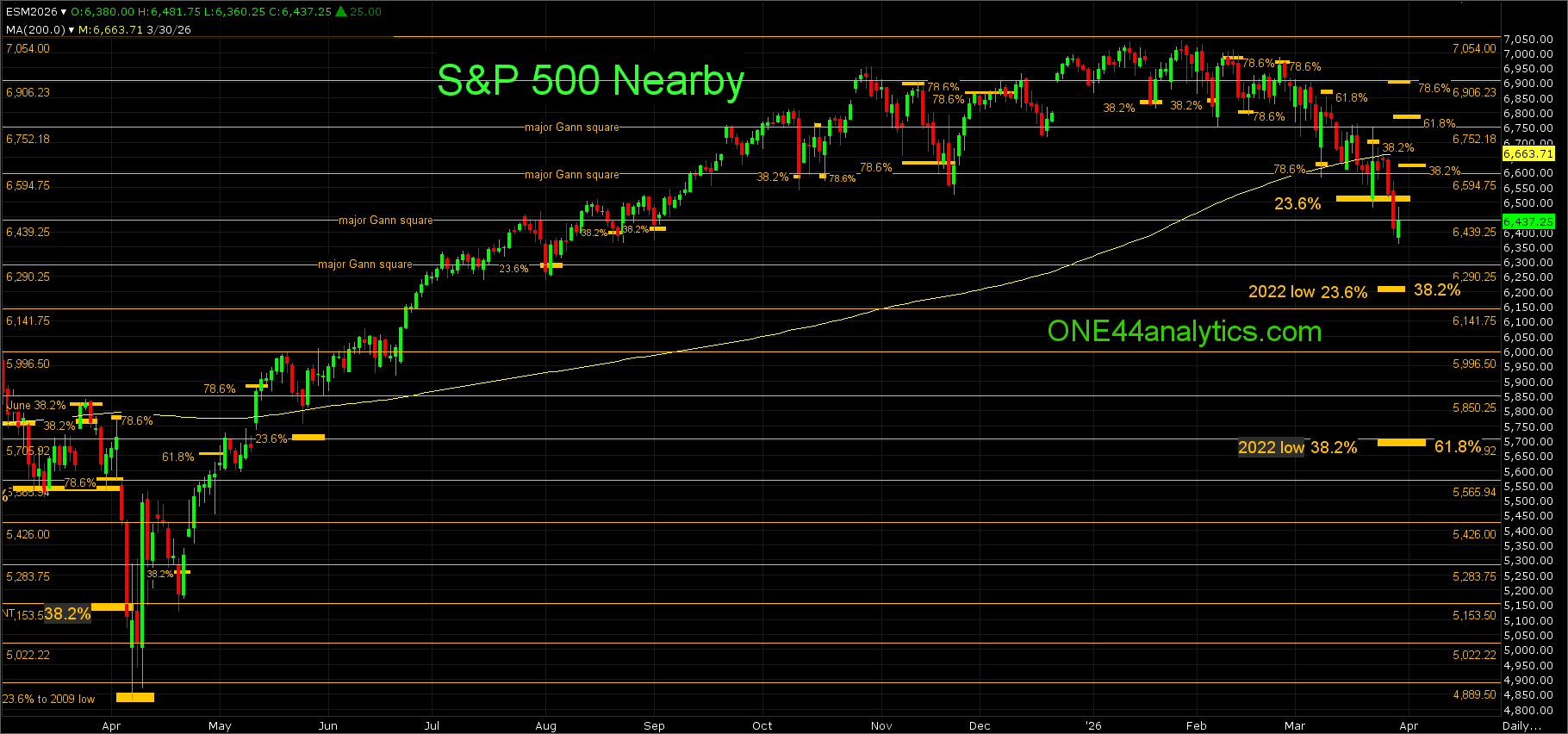 June The June contract also hit 38.2% back to the 2022 low on 3/23/26 at 4135.00, this was also a major Gann square. The key level for the week will be 38.2% back to the high on 1/29/26 at 4722.00, if this is all it can rally coming from a much longer term 38.2% level it would be a negative sign and a new low can quickly follow.