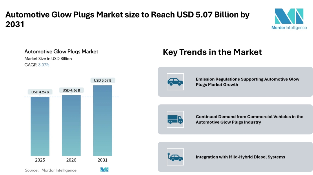 According to Mordor Intelligence, the automotive glow plugs market size is projected to grow from USD 4.23 billion in 2025 to USD 4.36 billion in 2026, reaching USD 5.07 billion by 2031, at a CAGR of 3.07% during the forecast period. This steady expansion reflects a balance between regulatory pressure and continued diesel engine relevance, especially in commercial vehicles.