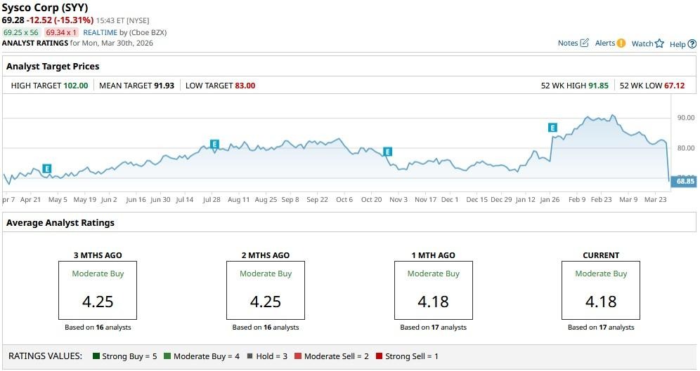 The consensus rating on Sysco Corp remains at “Moderate Buy”, with the mean target of about $92 indicating potential upside of nearly 35% from here.
