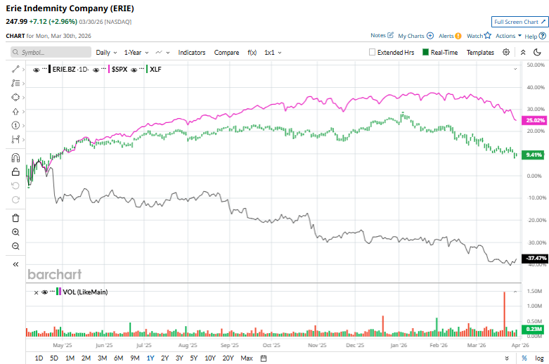 ERIE stock has declined 39.6% over the past 52 weeks, underperforming the S&P 500 Index's ($SPX) 13.7% return and the State Street Financial Select Sector SPDR ETF's (XLF) 1.7% rise over the same period.