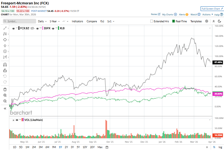 FCX stock has climbed 42.2% over the past year, outpacing the S&P 500 Index’s ($SPX) 13.7% gains and the Materials Select Sector SPDR Fund’s (XLB) 15.4% rally over the same time frame.