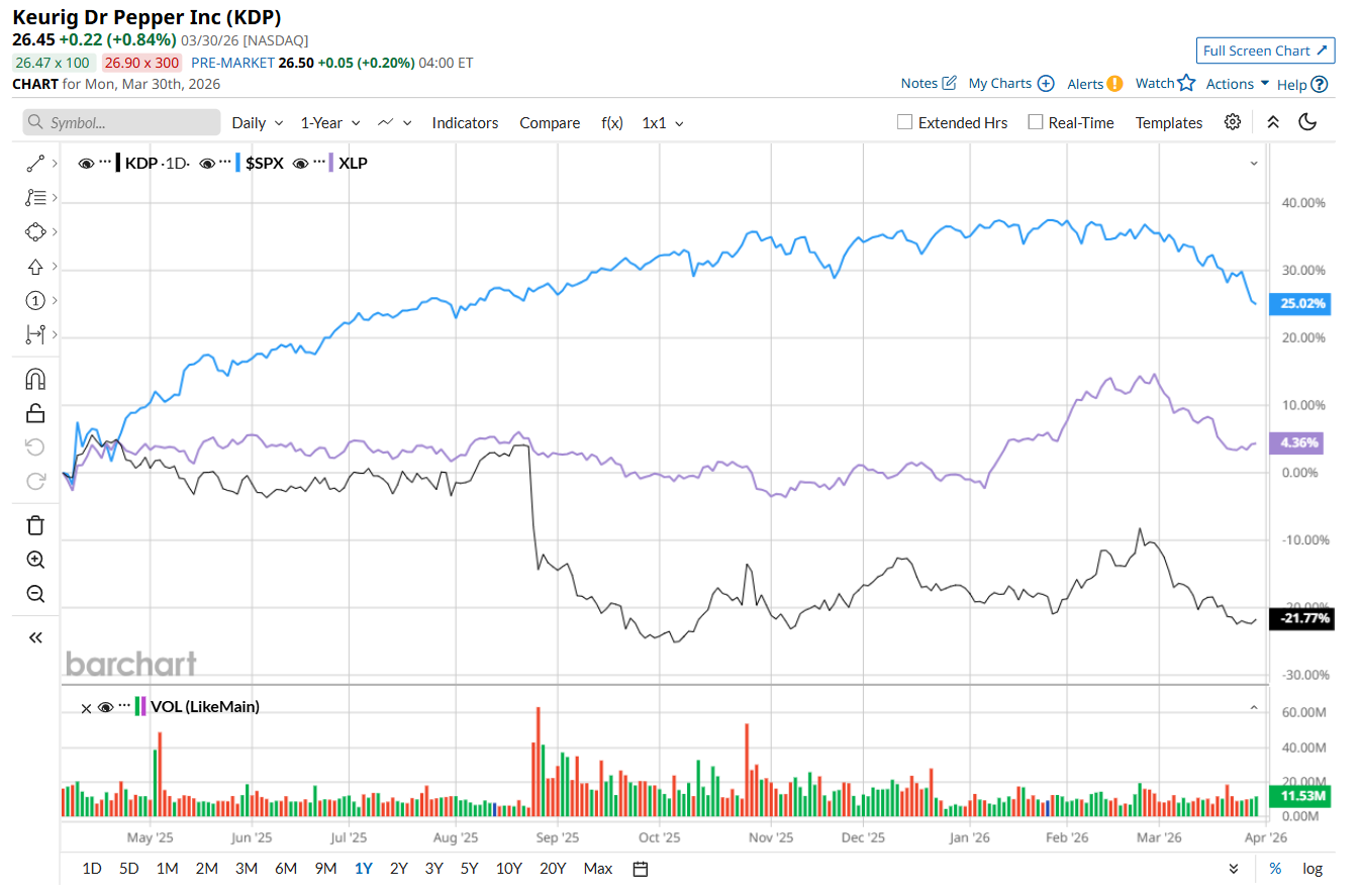 KDP has declined 21.6% over the past 52 weeks, notably trailing both the S&P 500 Index's ($SPX) 13.7% return and the State Street Consumer Staples Select Sector SPDR ETF’s (XLP) 1.8% uptick over the same time period.