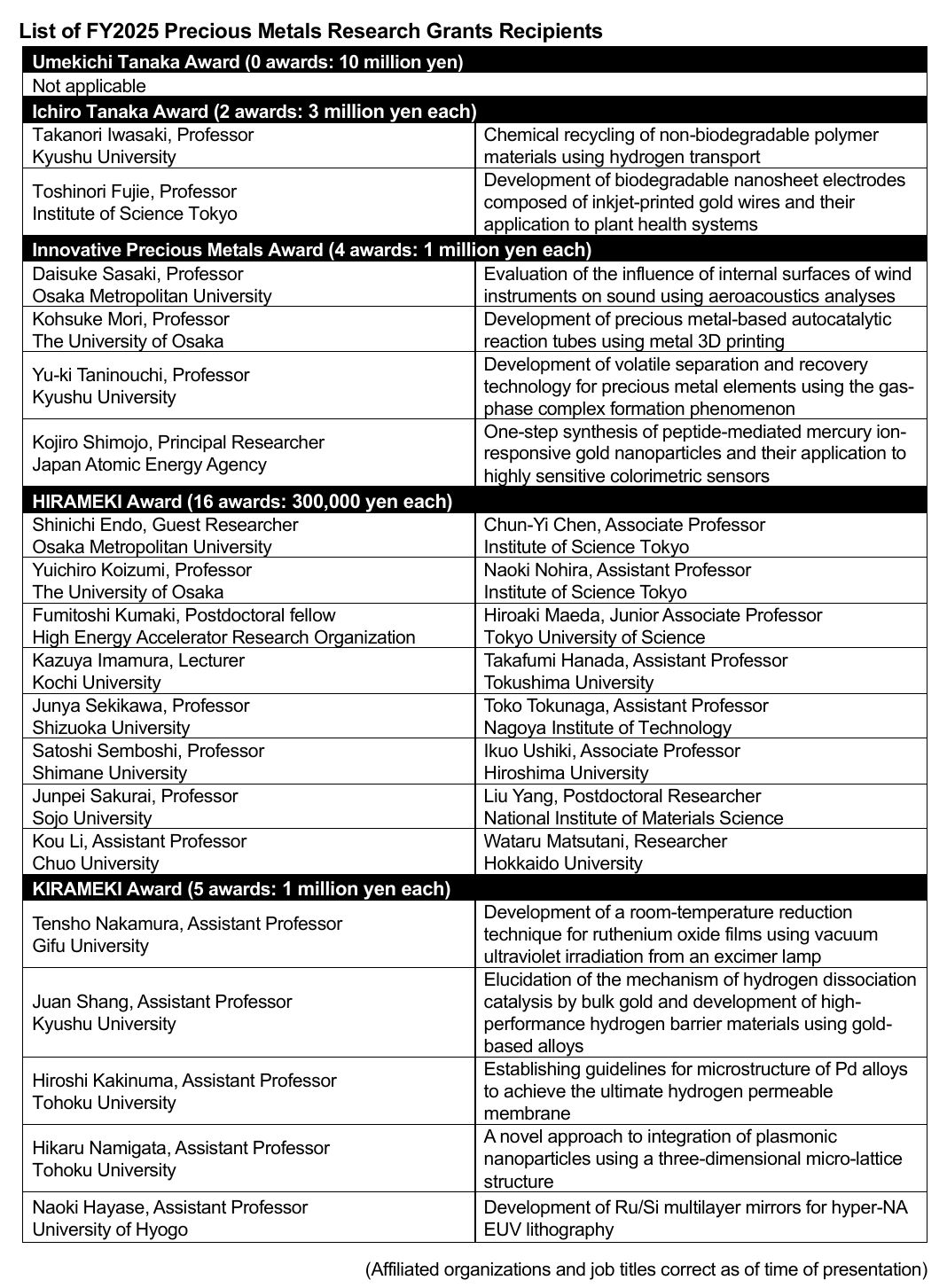 Four Innovative Precious Metals Awards, 16 HIRAMEKI Awards, and five KIRAMEKI Awards were also granted. The recipients and an overview of the Precious Metals Research Grants are indicated below. Applications for the FY2026 research grants are scheduled to open in the fall.