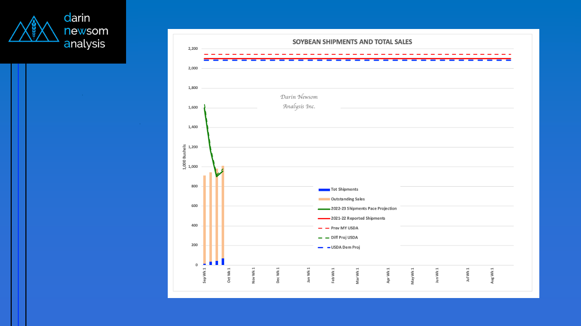 Yes, US export shipments are off to a slow start this marketing year, but the interesting thing is, according to USDA, shipments through late September were only 1 mb behind last year’s pace. Reported shipments for 2021-2022 came in at 2.101 bb (note I’m talking about actual reported shipments rather than USDA’s Supply and Demand estimate of 2.145 bb). So there’s still a good chance we could see shipments pick up, if the Mighty Mississippi will allow it. Also in the latest set of export numbers, the world’s largest buyer – China – reportedly had 499 mb of 2022-2023 purchases on the books as compared to 429 mb the same time last year. This makes up a big part of all unshipped 2022-2023 sales reported at 670 mb versus 602 mb from a year ago.Â