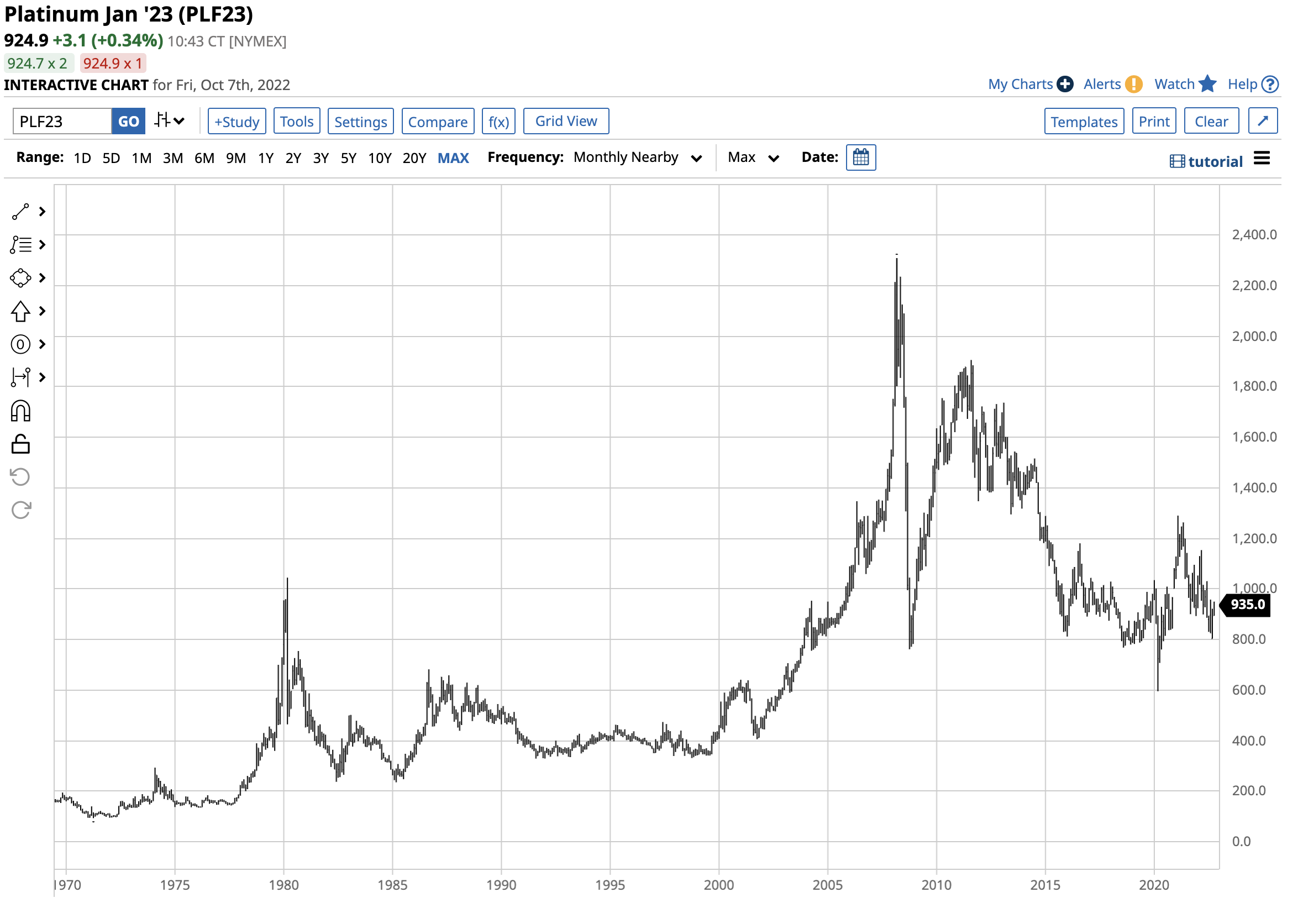 The chart shows platinum futures have made lower highs and lower lows since reaching an all-time peak in 2008 at over $2,300 per ounce. Platinum futures slightly underperformed gold over the first nine months of 2022, with a 9.96% decline. Platinum lost 10.47% in 2021, and its 11.10% gain in 2020 was less than half of gold’s appreciation. Nearby NYMEX platinum futures closed Q3 at $870 per ounce and were higher at the $925 level on the active month January futures contract on October 7.