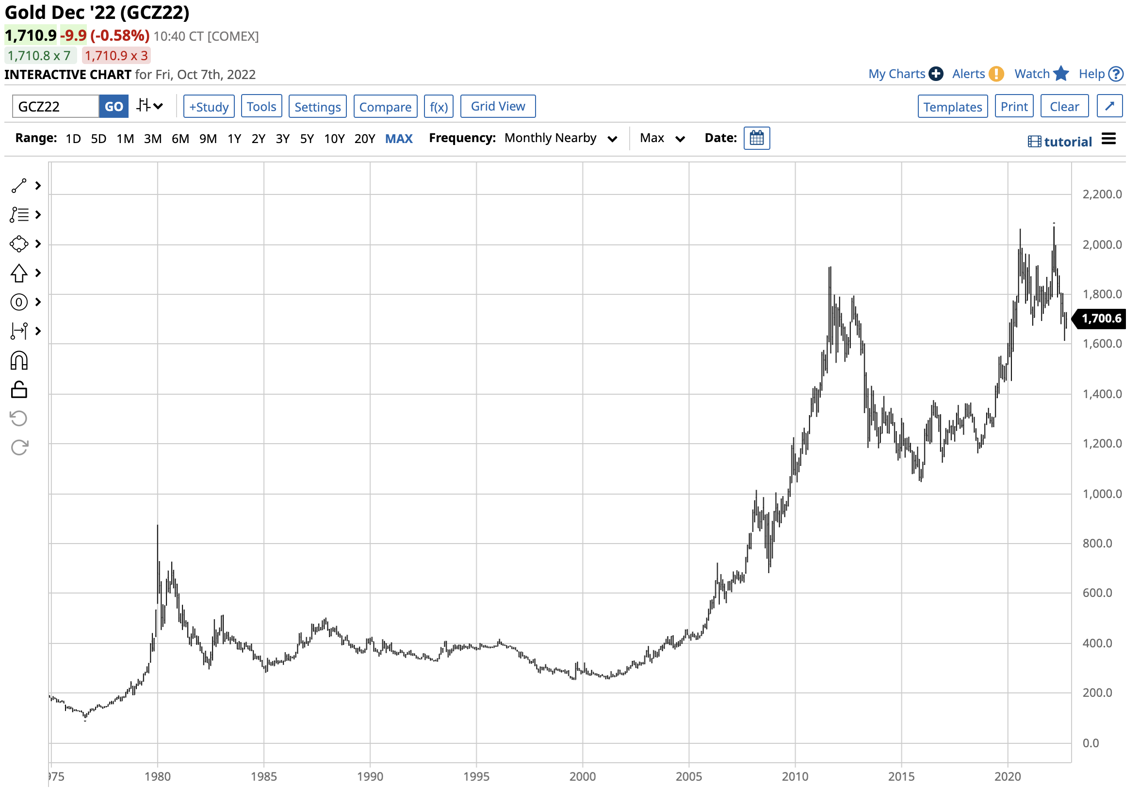 The chart shows that gold futures corrected and display a short-term bearish pattern. However, the long-term trend since the 1970s remains bullish. In Q3, gold futures fell 7.83% and were 9.09% lower over the first nine months of 2022. While gold declined 3.51% in 2021, the precious metal gained 24.42% in 2020. Nearby gold futures settled at the $1,662.40 level on September 30, 2022, and the December futures contract was higher at around the $1,710 level on October 7.Â