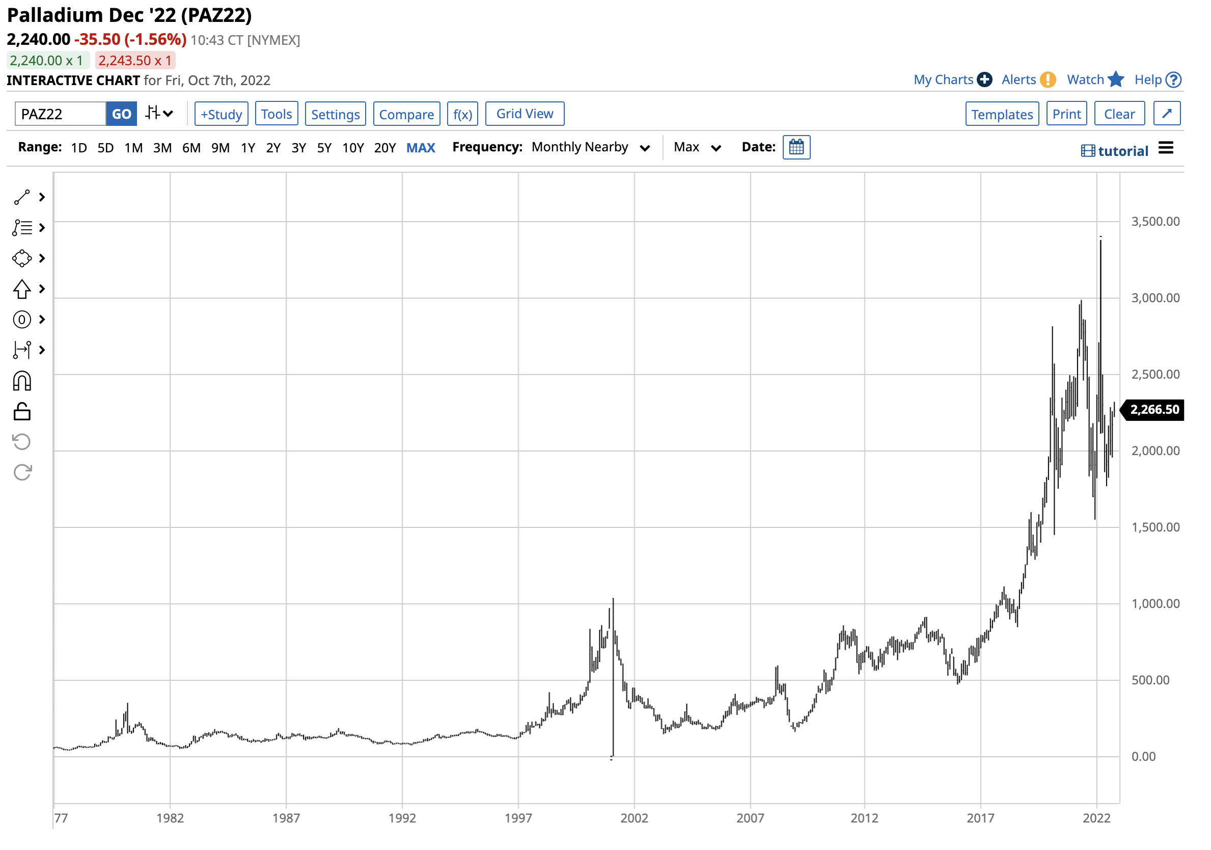 The chart highlights palladium’s ascent over the past years. After making higher lows and higher highs this century, the price took off on the upside in 2018 when it broke above the 2001 previous record peak. In Q3, NYMEX palladium was the only winner in the precious metals arena, posting a 14.33% gain for the quarter. Since the end of 2021, palladium futures have gained 14.13% after losing 22.08% in 2021. However, in 2020, palladium futures gained 28.52% and were 58.48% higher in 2019. Palladium was higher at the $2,240 level on October 7. The bull market in palladium continued as Russian supply concerns supported the precious metal that is a crucial ingredient in automobile catalytic converters.Â