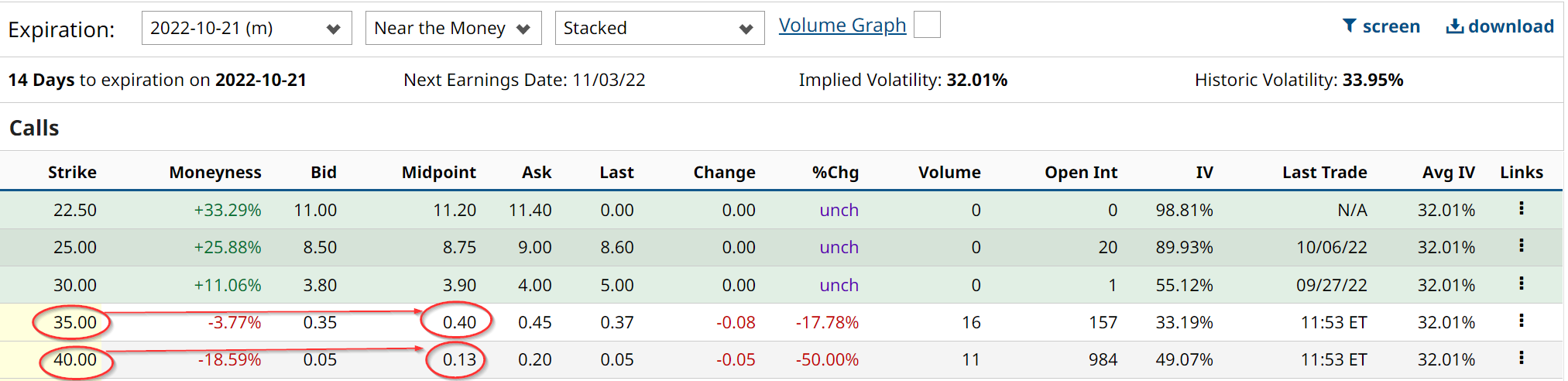 Enterprising investors can gain additional income by shorting out-of-the-money (OTM) covered calls and cash-secured puts. The following table shows that the $35 strike price for call options expiring in 14 days (Oct. 21) trades at a premium of 40 cents per contract.
